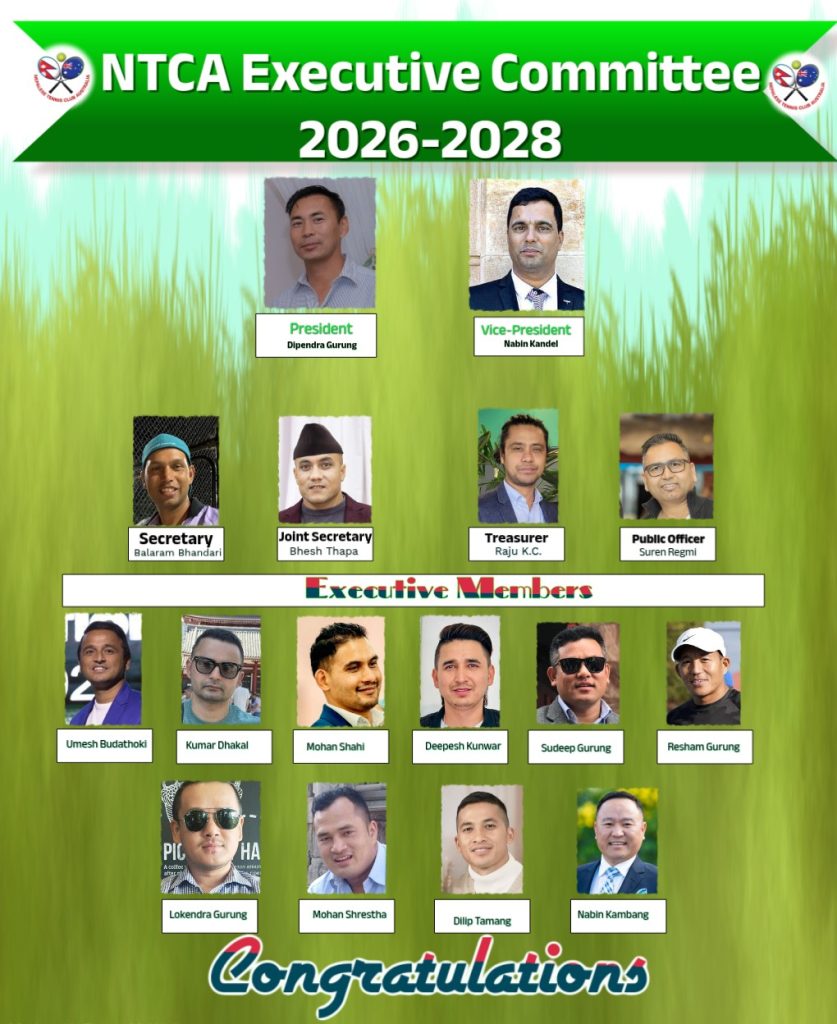 अस्ट्रेलिया / अस्ट्रेलियामा बसोबास गर्ने नेपाली समुदायबीच खेलकुदमार्फत स्वास्थ्य, मित्रता र सामाजिक एकता प्रवर्द्धन गर्दै आएको नेपाली टेनिस क्लब अस्ट्रेलिया (NTCA) ले सन् २०२६–२०२८ कार्यकालका लागि दिपेन्द्र गुरुङको नेतृत्वमा नयाँ कार्यसमिति चयन गरेको छ। अनुभवी, समर्पित र खेलप्रेमी नेतृत्वको आगमनसँगै क्लबले अझ सशक्त कार्यक्रम, व्यवस्थित संरचना र दीर्घकालीन लक्ष्यसहित अघि बढ्ने विश्वास व्यक्त गरेको छ।