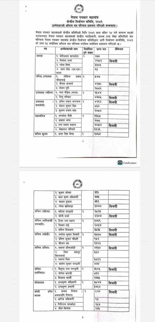 खुल्ला सचिवमा रमेश खतिवडा, सचिव महिलामा सोनी शर्मा,सचिव आदिवासी जनजातिमा सविन प्रियासन, सचिव मधेसीमा अशोक कुमार तिवारी, सचिव दलितमा प्रकाश धौलाकोटी र सचिव एसोसियटमा वैकुण्ठराज पराजुली विजयी भएका छन् । त्यस्तै कोषाध्यक्षमा रामकृष्ण अधिकारी विजयी भए । पत्रकार महासङ्घको नयाँ नेतृत्व चयनका लागि शुक्रबार निर्वाचन भएको थियो ।