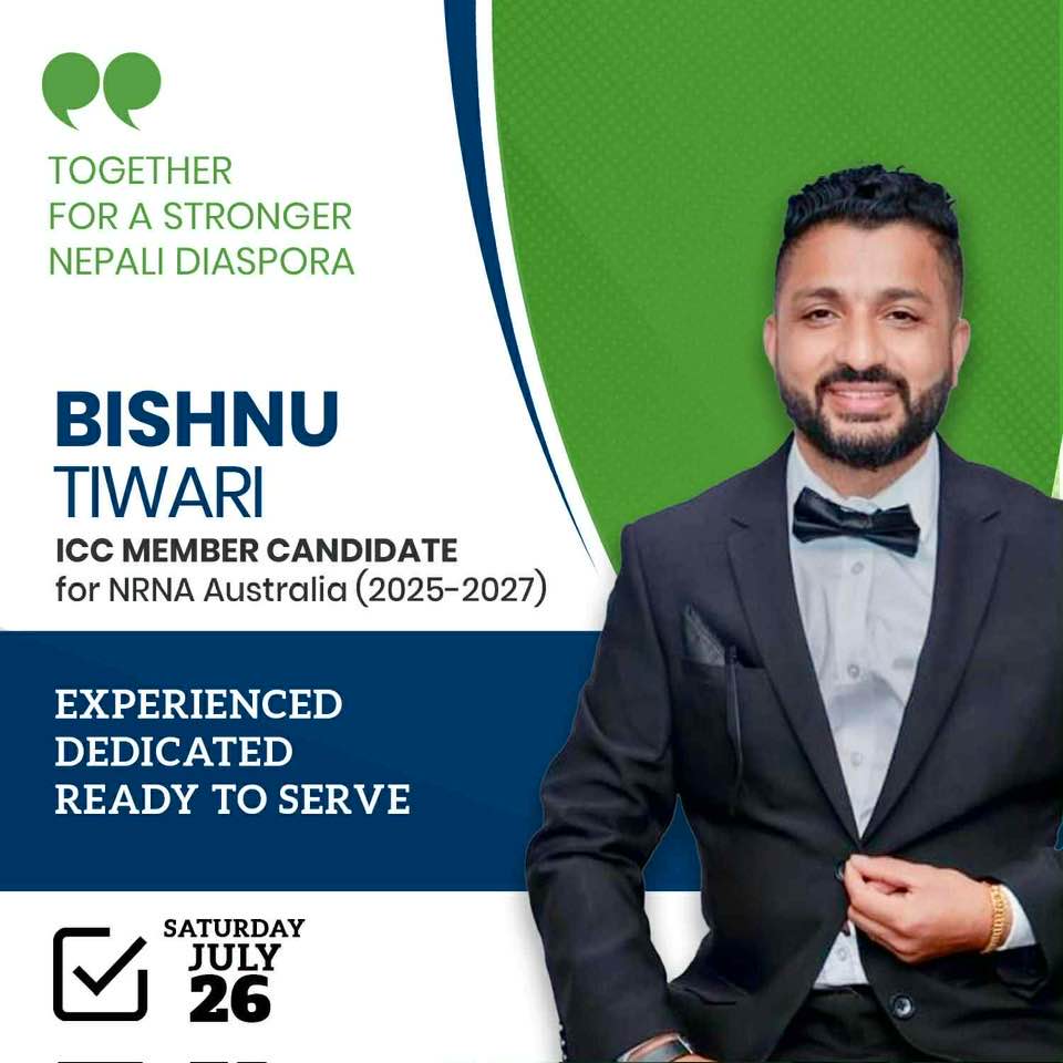 एडिलेड,अष्ट्रेलिया -अष्ट्रेलियाको एडिलेडमा स्थायी रूपमा बसोबास गर्दै आएका सामाजिक तथा संस्थागत गतिविधिमा सक्रिय व्यक्तित्व बिष्णु तिवारीले आगामी कार्यकाल (२०२५–२७) का लागि गैरआवासीय नेपाली संघ (NRNA) को अन्तर्राष्ट्रिय समन्वय परिषद् (ICC) सदस्य पदमा उम्मेदवारी घोषणा गरेका छन्।