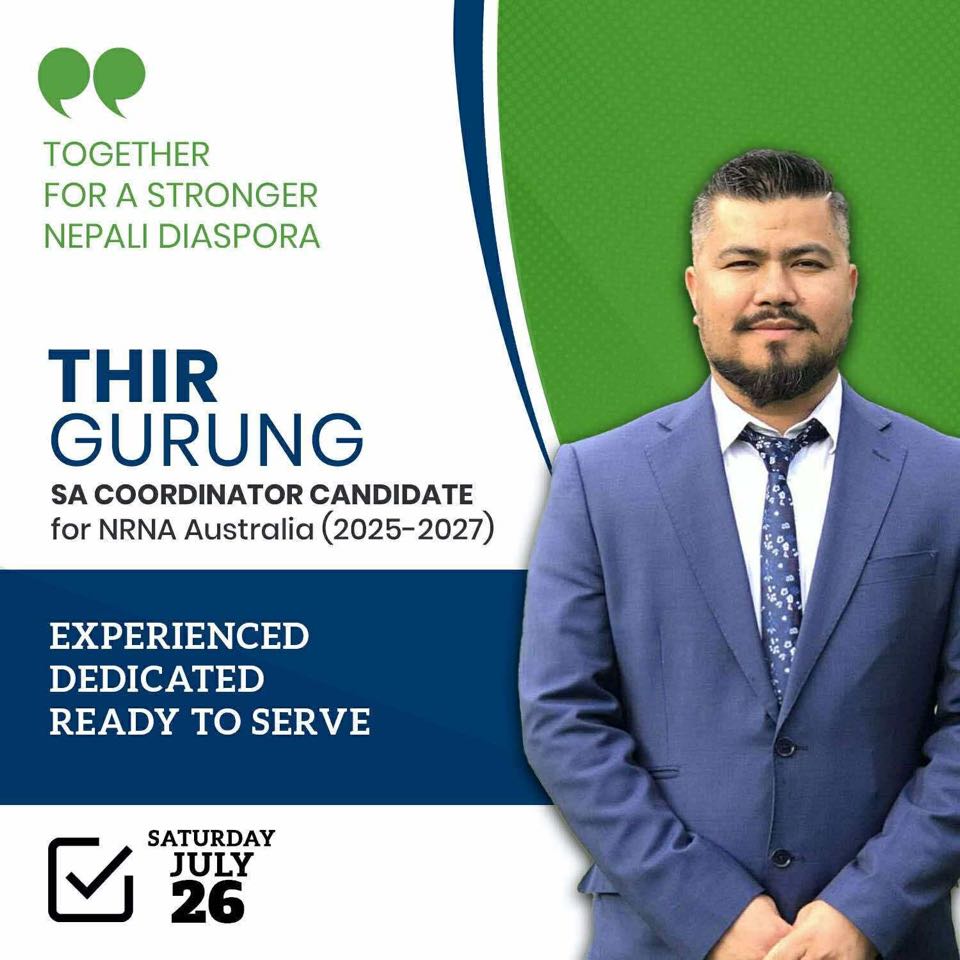 एडिलेड,अष्ट्रेलिया / गैर–आवासीय नेपाली संघ (एनआरएनए) अष्ट्रेलियाको २०२५–२०२७ कार्यकालका लागि दक्षिण अष्ट्रेलियाको राज्य संयोजक पदमा थिर गुरुङले आफ्नो उम्मेदवारी औपचारिक रूपमा घोषणा गरेका छन्। लामो समयदेखि अष्ट्रेलियामा बसोबास गर्दै आएका गुरुङले आगामी जुलाई २६ मा हुने निर्वाचनमा सहभागिता जनाउँदै आफूले सामाजिक उत्तरदायित्व, पारदर्शिता र सहकार्यलाई मूल आधार मानेर नेतृत्वदायी भूमिकामा अघि बढ्न चाहेको स्पष्ट पारेका छन्।
