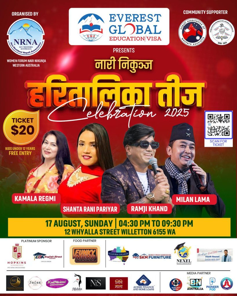 वेस्टर्न,अष्ट्रेलिया- पश्चिमी अष्ट्रेलियाको विलेटनमा आगामी आइतबार, १७ अगस्ट २०२५ का दिन, नेपाली समुदायले हरितालिका तीजको भव्य उत्सव विशेष सांगीतिक र सांस्कृतिक कार्यक्रमसहित मनाउने भएको छ। गैरआवासीय नेपाली संघ (NRNA) पश्चिम अष्ट्रेलिया र महिला फोरम नारी निकुञ्जको आयोजनामा तथा एभरेष्ट ग्लोबल एजुकेशन/भिसाको मुख्य प्रायोजनमा आयोजना हुन लागेको यो कार्यक्रम अष्ट्रेलियामा रहेका नेपालीहरूका लागि आफ्नो संस्कृति, परम्परा र आपसी एकताको भावना बलियो बनाउने महत्वपूर्ण अवसर बन्ने अपेक्षा गरिएको छ।