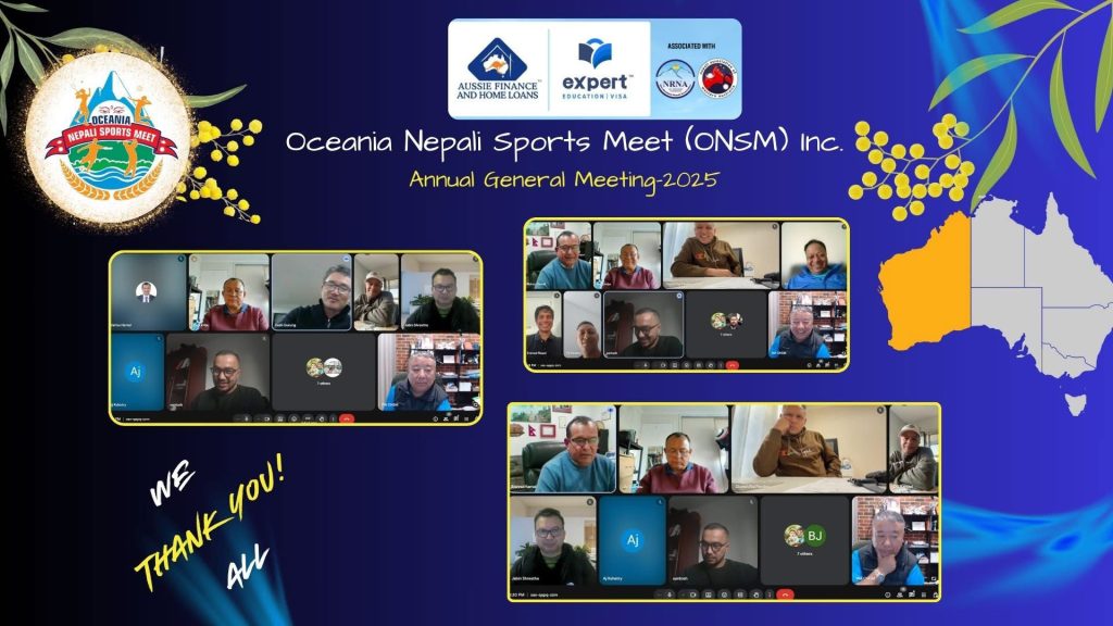 अष्ट्रेलिया — ओशिनियाका नेपालीहरूको “ओलम्पिक” मानिने ओशिनिया नेप्लिज स्पोर्ट्स मिटको आगामी संस्करण एडिलेडमा भव्य रूपमा आयोजना हुने भएको छ। आइतवार सम्पन्न साधारण सभाले ७औँ ओशिनिया नेप्लिज स्पोर्ट्स मिट संयोजन समिति अध्यक्षमा बिजय जोशीलाई चयन गरेको छ।
