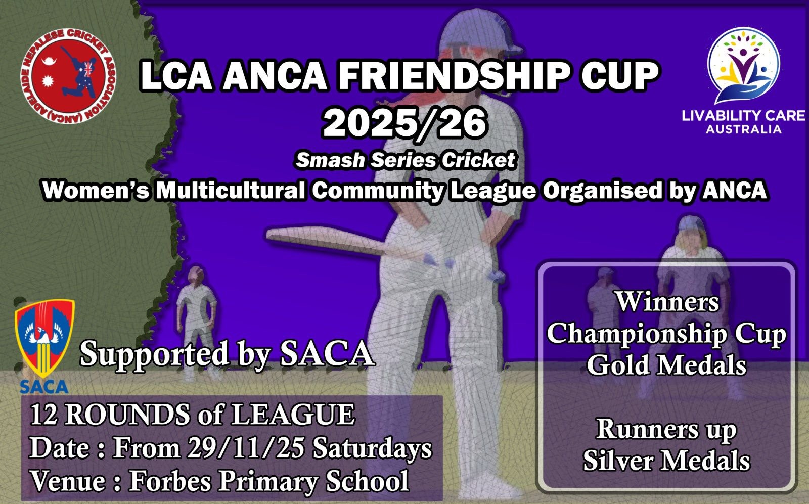 एडिलेड । नेपाली महिला क्रिकेटको विकास र बहुसांस्कृतिक समुदायबीचको खेलमैत्री सम्बन्धलाई सुदृढ बनाउने लक्ष्यसहित नेप्लिज क्रिकेट एशोसिएसन (एन्का) ले यस वर्ष पनि बहुप्रतिक्षित एलसिए–एन्का फ्रेन्डसिप कप आयोजना गर्ने भएको छ। यही नोभेम्बर २९, शनिबार साउथ अष्ट्रेलियाका चार प्रमुख समुदाय—नेपाली, भारतीय, पाकिस्तानी र श्रीलंकाली महिला क्रिकेट टिमहरूले मैत्रीपूर्ण प्रतियोगितामा प्रतिस्पर्धा गर्ने एन्का अध्यक्ष विजय जोशीले बताएका छन्।