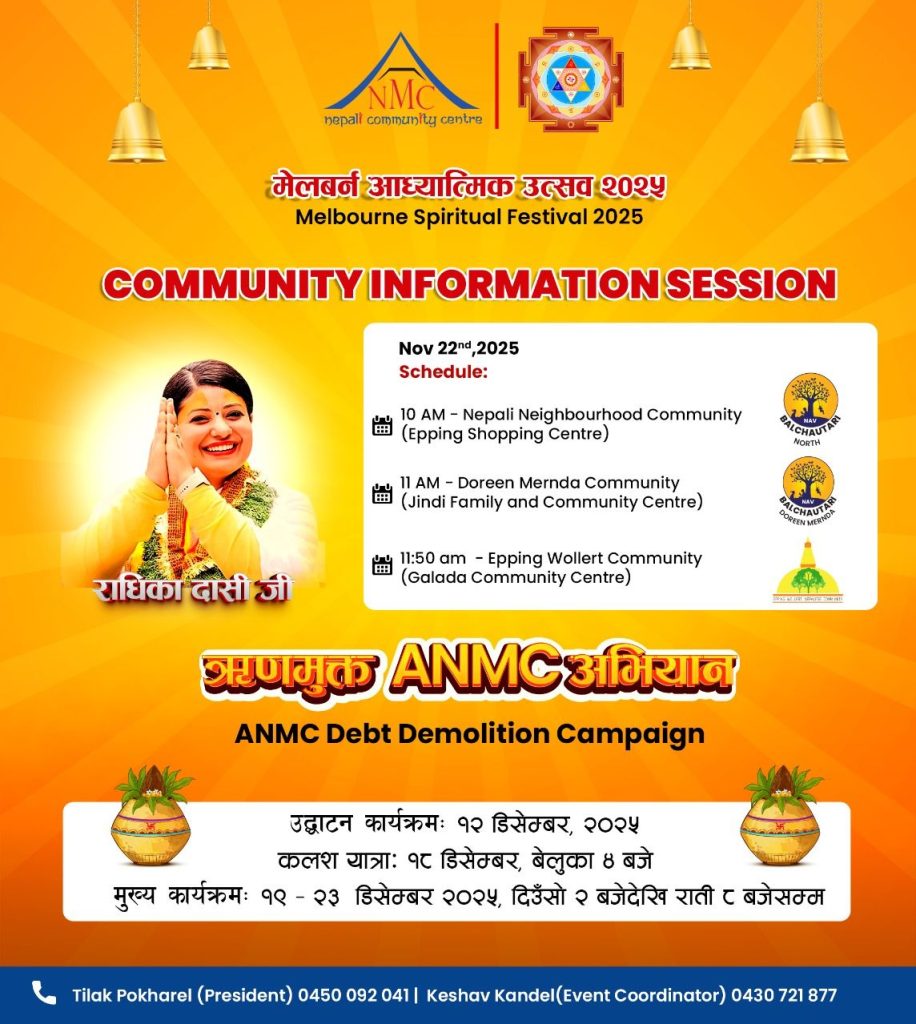 मेलबर्न,अष्ट्रेलिया / अष्ट्रेलियाको मेलबर्नमा अवस्थित नेपाली समुदायको सबैभन्दा ठूलो संस्था अष्ट्रेलियन नेप्लिज मल्टिकल्चरल सेन्टर (ANMC) ले यस वर्ष पनि भव्य धार्मिक महोत्सव आयोजना गर्ने भएको छ। यो संस्था मेलबर्नमा पशुपति मन्दिर, गुम्बा तथा नेपाली सांस्कृतिक केन्द्र निर्माण गर्ने उद्देश्यसहित स्थापना गरिएको हो। केन्द्रले हालसम्म खरिद गरिएको भूमि र संरचनासम्बन्धी ऋण फस्र्यौट गर्ने लक्ष्यसहित यो धार्मिक महोत्सवको आयोजना गरेको बताइएको छ।