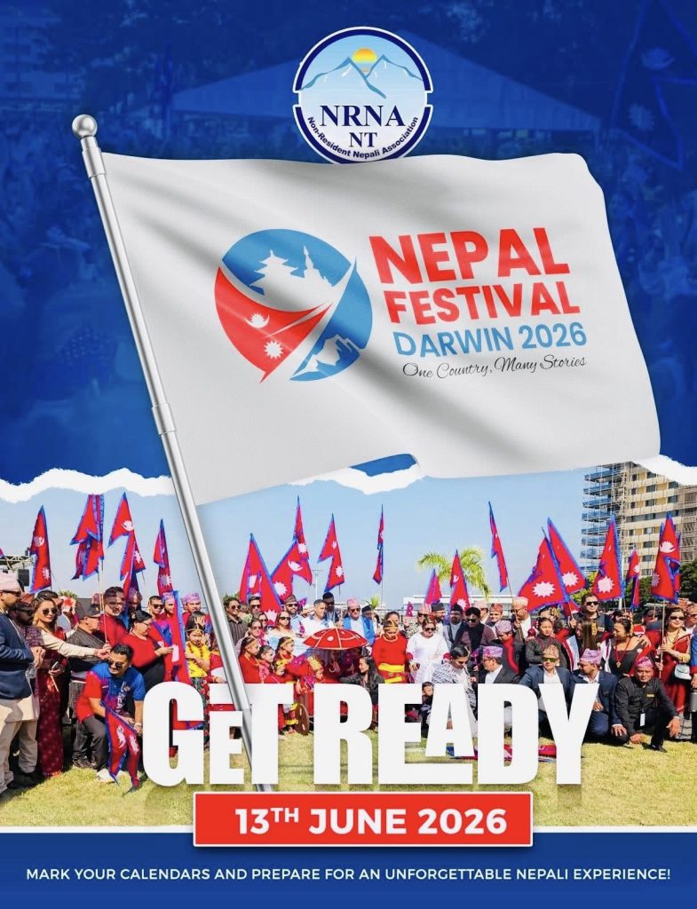 डार्विन- नर्दन टेरेिटोरीस्थित गैरआवासीय नेपाली संघ (NRNA) ले आफ्नो गौरवको र प्रमुख कार्यक्रम ‘नेपाल फेस्टिवल डार्विन २०२६’ को मिति औपचारिक रूपमा घोषणा गरेको छ। १३ जुन २०२६ शनिबारका दिन डार्विन वाटरफ्रन्ट मा आयोजना हुने यस महोत्सवले नेपाली संस्कृति, परम्परा र रंगीन उत्सवको जीवंत माहोल ल्याउनेछ।