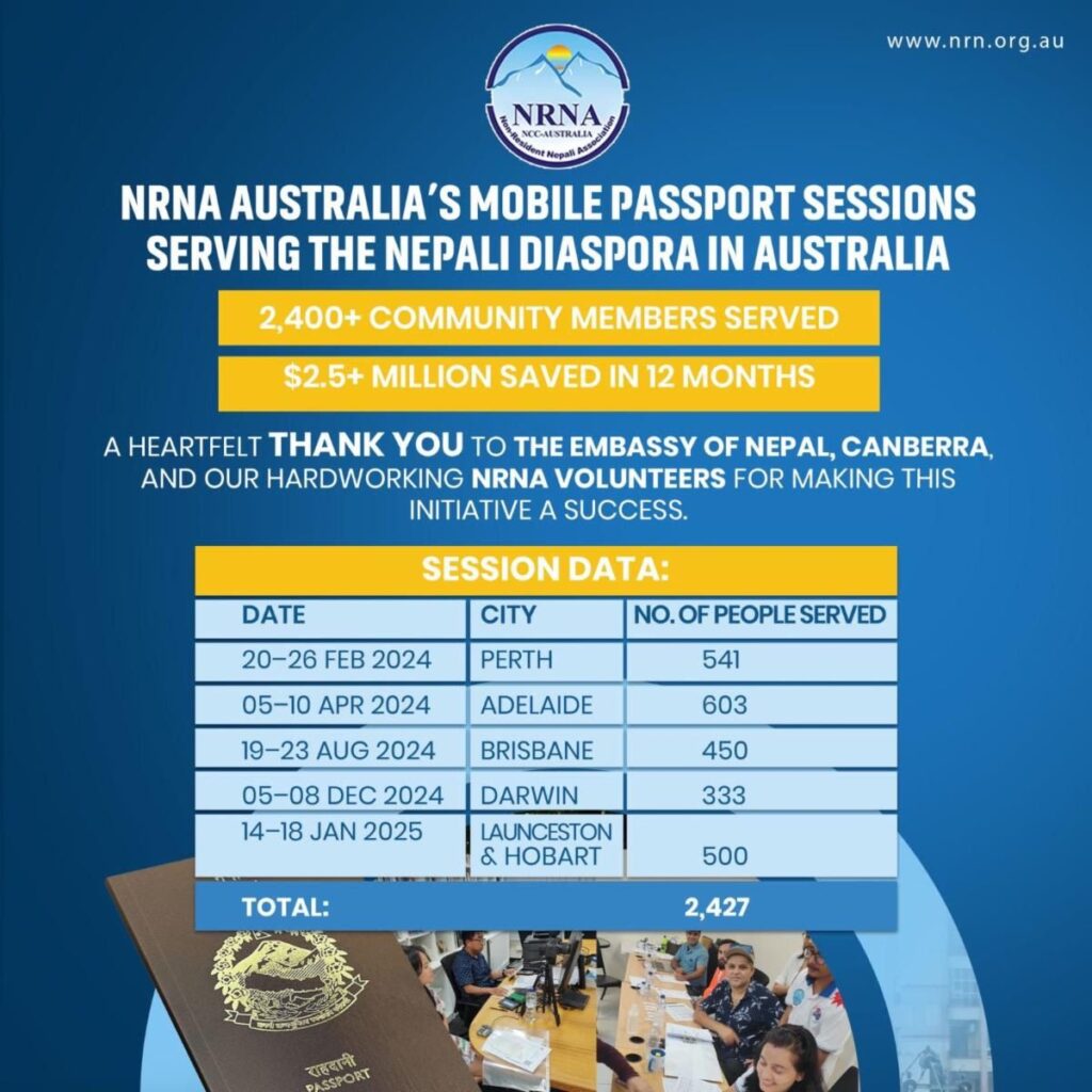 अस्ट्रेलिया/ अस्ट्रेलियाका विभिन्न राज्यहरूमा नेपाली दूतावास र गैरआवासीय नेपाली संघ (एनआरएनए) अस्ट्रेलियाको सहकार्यमा आयोजित पासपोर्ट घुम्ती शिविरमार्फत एकै वर्षमा २४ सयभन्दा बढी नेपालीहरूले पासपोर्ट नविकरण सेवा लिएका छन्।