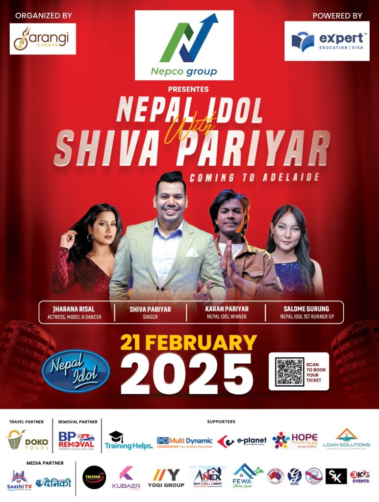अस्ट्रेलिया- “नेपाल आइडल उईथ शिव परियार” नाम दिईएको अस्ट्रेलियामा हुने विभिन्न सांगीतिक कार्यक्रमका लागि चर्चित गायक शिव परियार, नेपाल आइडल सिजन ५ का विजेता करण परियार, प्रथम उपविजेता सलोमी गुरुङ तथा चर्चित नेपाली अभिनेत्री झरना रिसाल अस्ट्रेलिया आइपुगेका छन्।