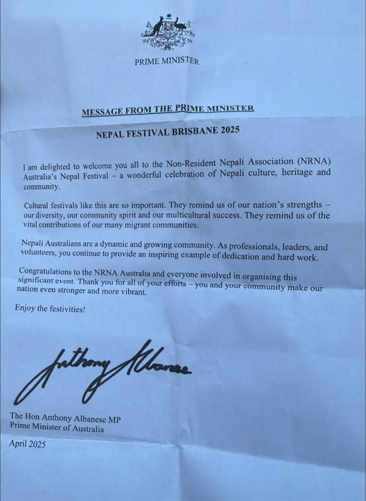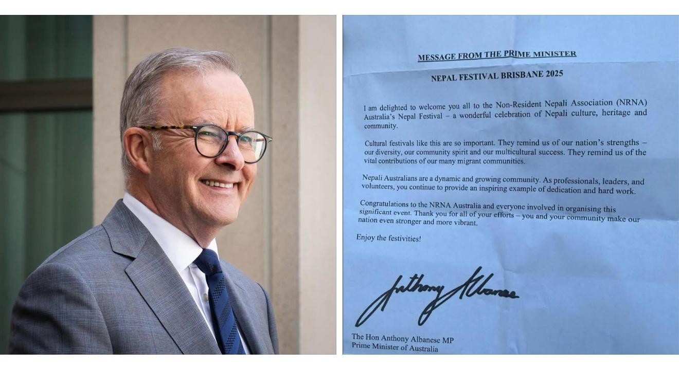 अष्ट्रेलिया — अष्ट्रेलियाका प्रधानमन्त्री एन्थोनी एल्बेनीजले गैर आवासीय नेपाली संघ (NRNA) अष्ट्रेलियाद्वारा हालै सम्पन्न गरिएको नेपाल फेस्टिवल ब्रिसबेन २०२५ को अवसरमा विशेष शुभकामना सन्देश पठाएका छन्। उक्त सन्देशमा उनले अष्ट्रेलियामा रहेका नेपालीहरूको योगदानको प्रशंसा गर्दै,यो उत्सवलाई अष्ट्रेलियाली समाजको विविधता र बहुसांस्कृतिक पहिचानको प्रतीकका रूपमा वर्णन गरेका छन्।