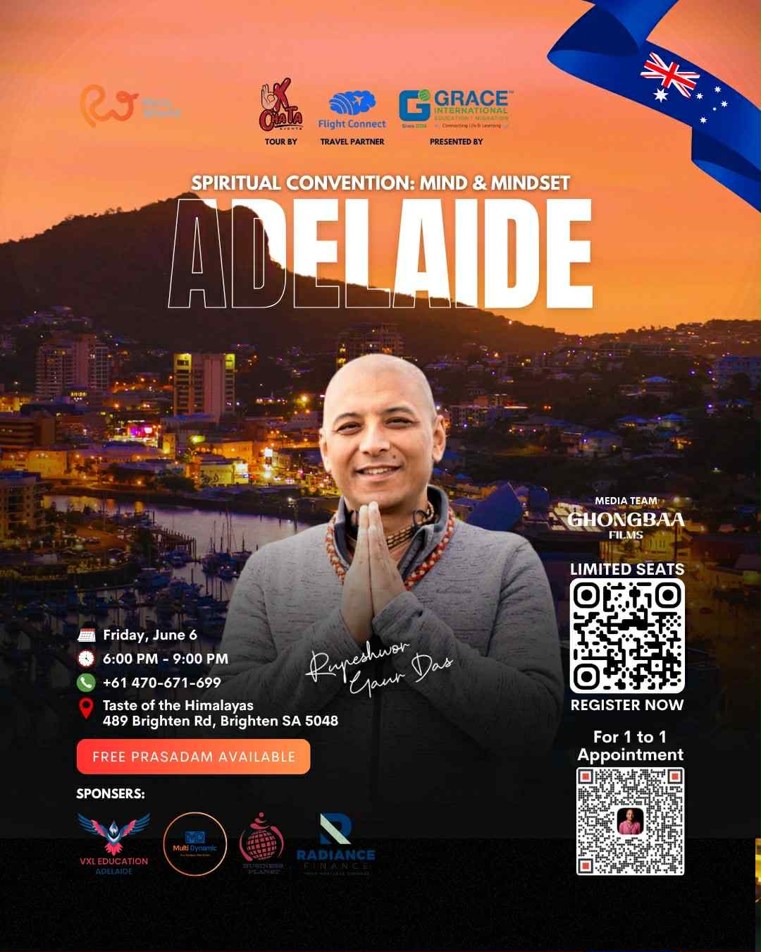 एडिलेड, अष्ट्रेलिया – साउथ अस्ट्रेलियाको एडिलेड स्थित नेपाली समुदायका लागि एक विशेष आध्यात्मिक कार्यक्रम यही आउँदो शुक्रबार, जुन ६ तारिख आयोजना हुँदैछ। ‘Spiritual Convention: Mind and Mindset’ नाम दिइएको यस कार्यक्रममा अन्तर्राष्ट्रिय ख्यातिप्राप्त आध्यात्मिक मार्गदर्शक, प्रेरक वक्ता तथा वैदिक जीवनशैलीका अभ्यासकर्ता रुपेश्वर गौर दासको प्रमुख उपस्थित रहनेछ।