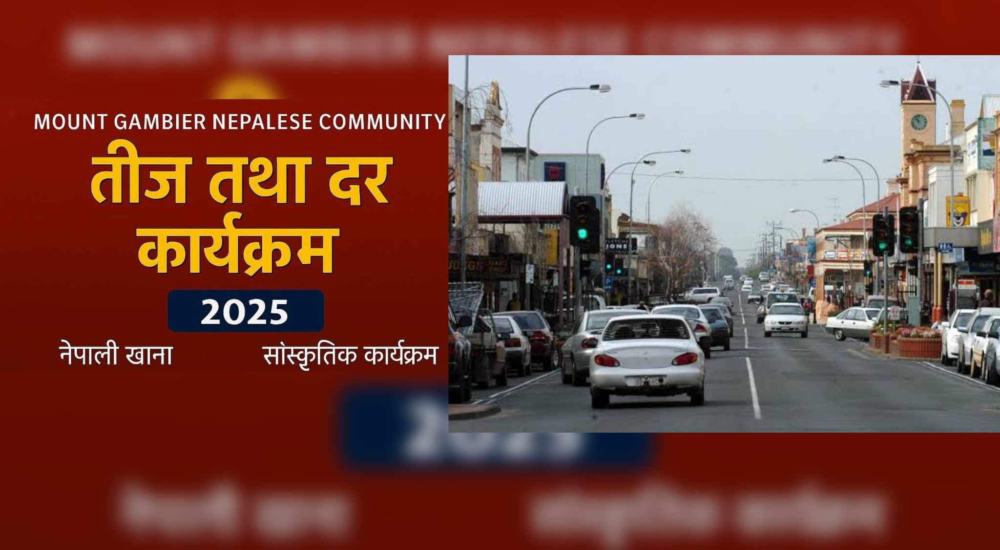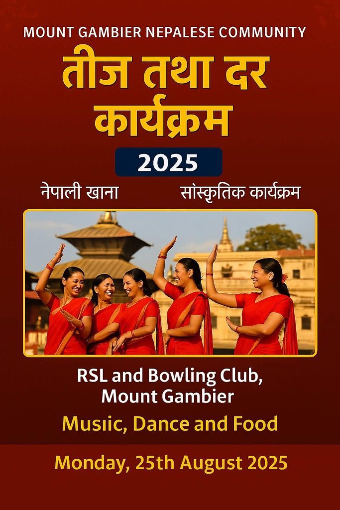 एडिलेड,अष्ट्रेलिया- नेपाली समुदायको मौलिक पर्व तीजको उल्लास अब अष्ट्रेलियाको माउन्ट ग्याम्बियरमा गुञ्जिने भएको छ। Mount Gambier Nepalese Community द्वारा आगामी २५ अगस्ट २०२५, सोमबारका दिन RSL and Bowling Club, Mount Gambier मा तीज तथा दर कार्यक्रमको आयोजना गरिँदैछ। कार्यक्रमलाई भव्य, सभ्य र सांस्कृतिक रूपमा सम्पन्न गर्न तयारी तीव्र गतिमा अघि बढाइएको छ।