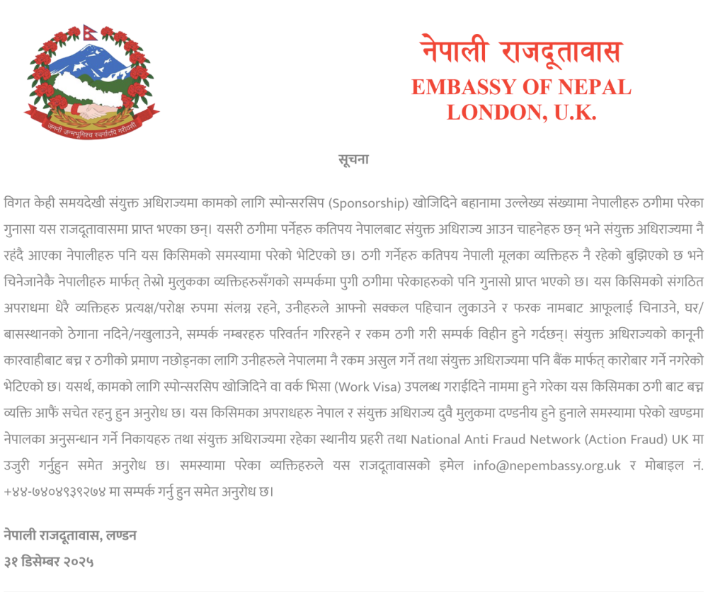 दुतावासले व्यक्तिहरुलाई कामको स्पोन्सरसिप वा वर्क भिसा उपलब्ध गराइदिने नाममा हुने ठगीबाट बच्न सचेत रहन आग्रह गर्दै, समस्यामा परेमा नेपालका अनुसन्धान निकाय, संयुक्त अधिराज्यको स्थानीय प्रहरी तथा National Anti Fraud Network (Action Fraud) UK मा उजुरी गर्न अनुरोध गरेको छ।