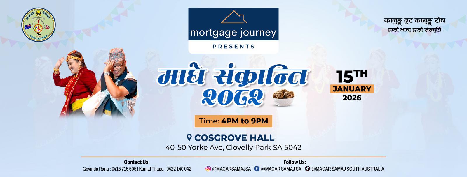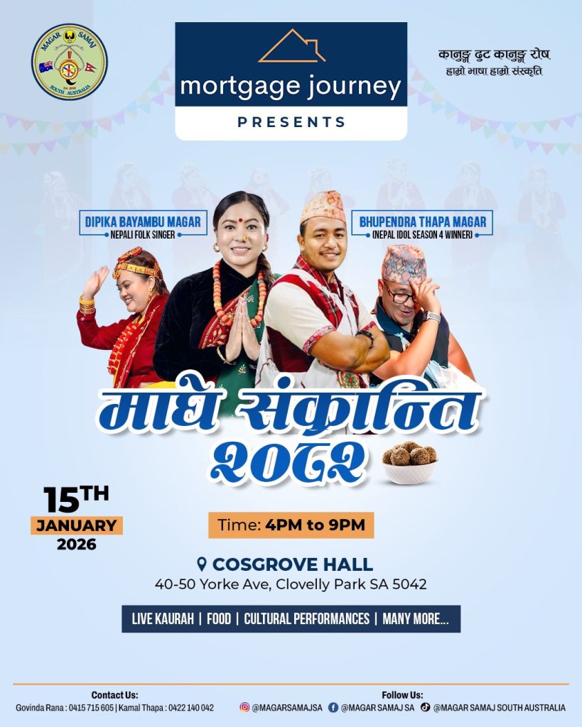 एडिलेड । नेपाली समुदायका लागि विशेष सांस्कृतिक महत्व बोकेको माघ १ अर्थात् माघे संक्रान्ति पर्व यस वर्ष पनि एडिलेडमा भव्य रूपमा मनाइने भएको छ। मगर समाज साउथ अष्ट्रेलियाको आयोजनामा तथा Mortgage Journey को प्रस्तुतिमा माघे संक्रान्ति–२०२६ कार्यक्रम आगामी जनवरी १५, २०२६ का दिन आयोजना हुने भएको हो।