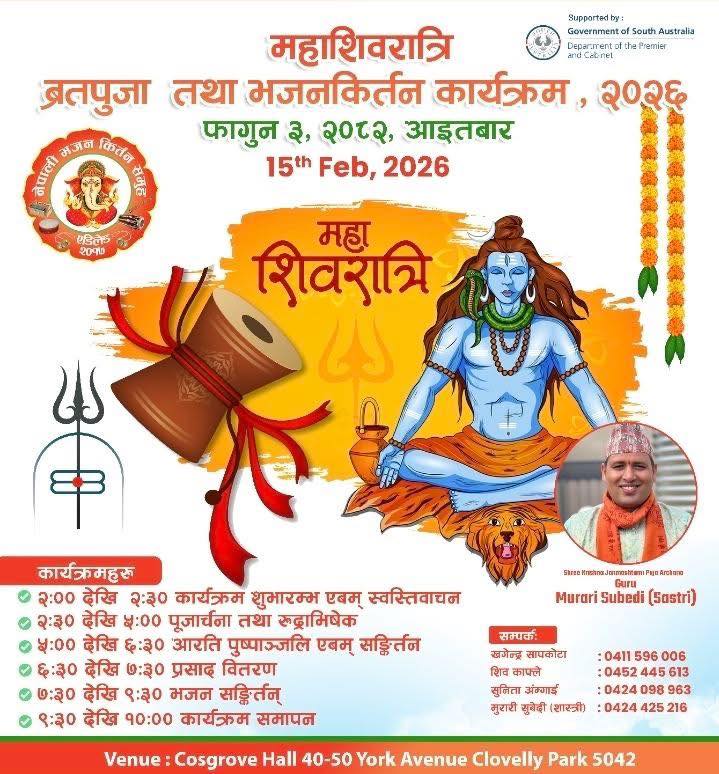 एडिलेड, अष्ट्रेलिया — नेपाली भजन कीर्तन समूह एडिलेडको आयोजनामा महाशिवरात्रिको पावन अवसरमा व्रतपूजा तथा भजन–कीर्तन कार्यक्रम २०२६ फागुन ३, २०८२ (१५ फेब्रुअरी २०२६) आइतबारका दिन क्लोभर्ली पार्कस्थित कोस्ग्रोभ हलमा आयोजना हुने भएको छ। दक्षिण अस्ट्रेलियामा बसोबास गर्ने नेपाली समुदायलाई लक्षित गरी आयोजना गरिएको यस कार्यक्रममा श्रद्धा, भक्ति र सांस्कृतिक एकताको सन्देश फैलाउने उद्देश्य रहेको आयोजकले जनाएको छ।