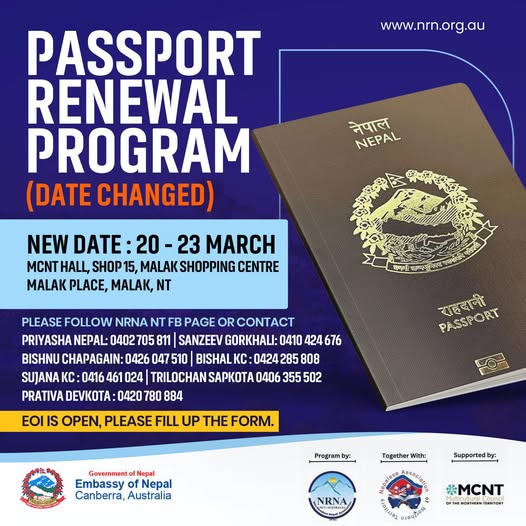 डार्विन,अस्ट्रेलिया / अस्ट्रेलियाको नर्दन टेरिटोरी यहाँ बसोबास गर्दै आएका नेपाली समुदायका लागि महत्वपूर्ण सूचना सार्वजनिक गरिएको छ। NRNA Northern Territory ले आयोजना गर्न लागेको राहदानी नवीकरण शिविरको मिति परिवर्तन गरी अगाडि सारिएको छ। Embassy of Nepal, Canberra को अनुरोधअनुसार यसअघि २८–३१ मार्च २०२६ मा सञ्चालन गर्ने तय गरिएको शिविर अब २०–२३ मार्च २०२६ (शुक्रबारदेखि सोमबारसम्म) आयोजना हुने भएको हो।