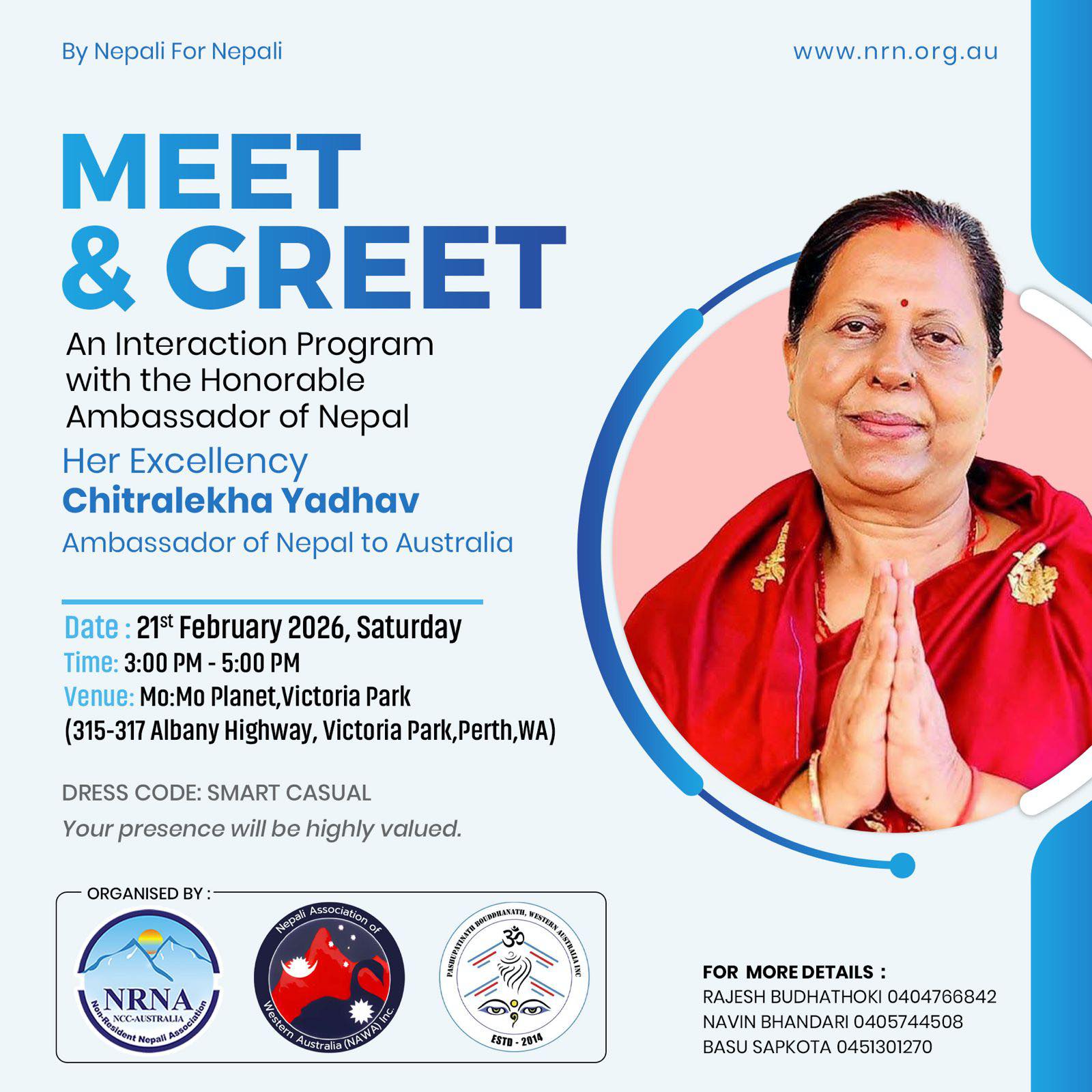 कार्यक्रमसम्बन्धी थप जानकारीका लागि राजेश बुढाथोकी, नवीन भण्डारी तथा बसु सापकोटासँग सम्पर्क गर्न सकिने जनाइएको छ। आयोजकहरूले “समुदायको एकता नै हाम्रो शक्ति” भन्ने भावनासहित महामहिमलाई पश्चिम अस्ट्रेलियामा स्वागत गर्न सबैलाई उपस्थितिका लागि आग्रह गरेका छन्।