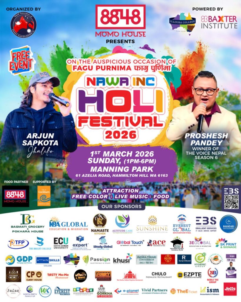 पर्थ, वेस्टर्न अस्ट्रेलिया — फागु पूर्णिमाको अवसर पारेर आगामी १ मार्च २०२६ मा पर्थको म्यानिङ पार्कमा ‘होली फेस्टिभल २०२६’ भव्य रूपमा आयोजना हुने भएको छ। नेपाली एसोसिएसन अफ वेस्टर्न अस्ट्रेलिया इन्क (NAWA Inc.) को आयोजनामा हुने उक्त महोत्सव दिउँसो १ बजेदेखि साँझ ६ बजेसम्म सञ्चालन हुनेछ र प्रवेश सबैका लागि निःशुल्क रहने जनाइएको छ।