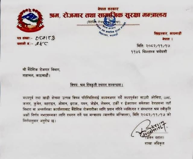 मन्त्रालयले वैदेशिक रोजगार विभाग, ताहाचललाई एक पत्र पठाउँदै विभाग वा अन्तर्गतका कार्यालयहरूबाट प्रदान गरिने यस्ता श्रम स्वीकृतिहरू तत्कालका लागि स्थगित गर्न निर्देशन दिएको छ । सो क्षेत्रमा विद्यमान असहज परिस्थिति र कामदारहरूको सुरक्षालाई ध्यानमा राखेर मन्त्रालयले यो कदम चालेको हो । अर्को सूचना जारी नभएसम्म यो स्थगित प्रक्रिया जारी रहनेछ ।