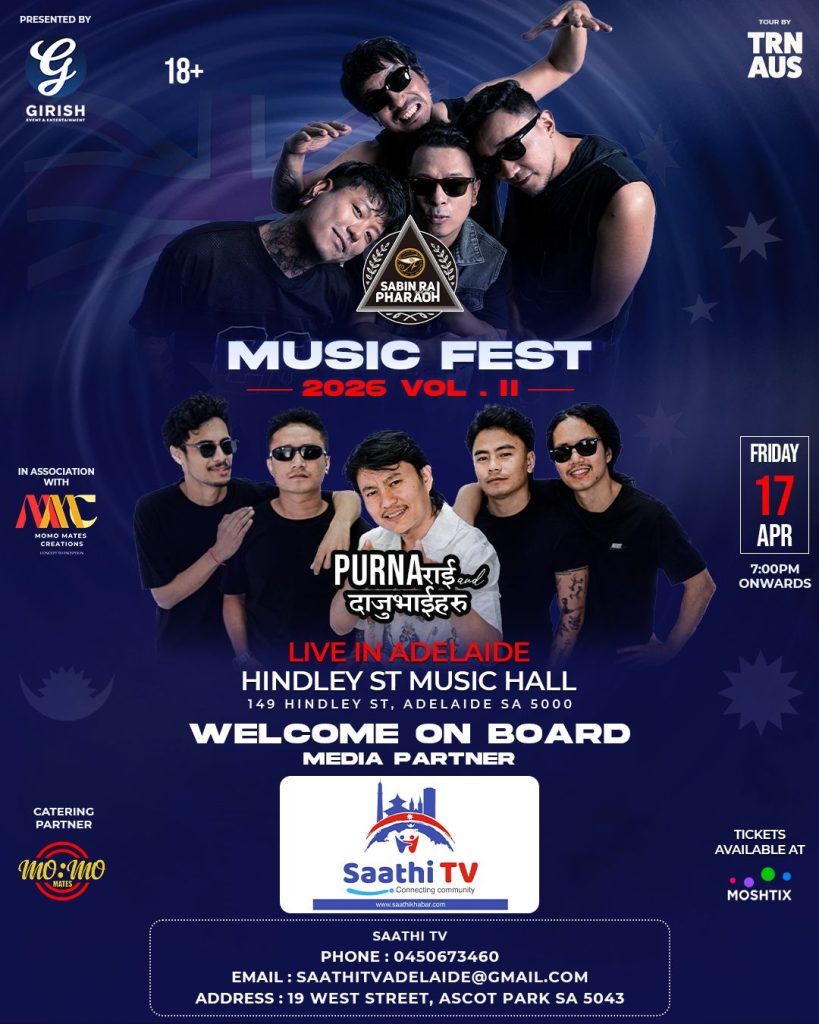 एडिलेड,अष्ट्रेलिया/ एडिलेड अष्ट्रेलियाको एडिलेडमा नेपाली सांगीतिक माहोललाई थप उत्साहपूर्ण बनाउने उद्देश्यसहित ‘म्युजिक फेस्ट २०२६ (भाग–२)’ आयोजना हुने भएको छ। नेपाली संगीतप्रेमीहरूका लागि विशेष मानिएको यस भव्य सांगीतिक कार्यक्रममा चर्चित गायक सबिन राई र उनको ब्याण्ड द फ्याराओ, पछिल्लो पुस्तामाझ लोकप्रिय पूर्ण राई तथा दाजुभाइहरू एउटै मञ्चमा आफ्नो प्रस्तुति दिने भएका छन्
