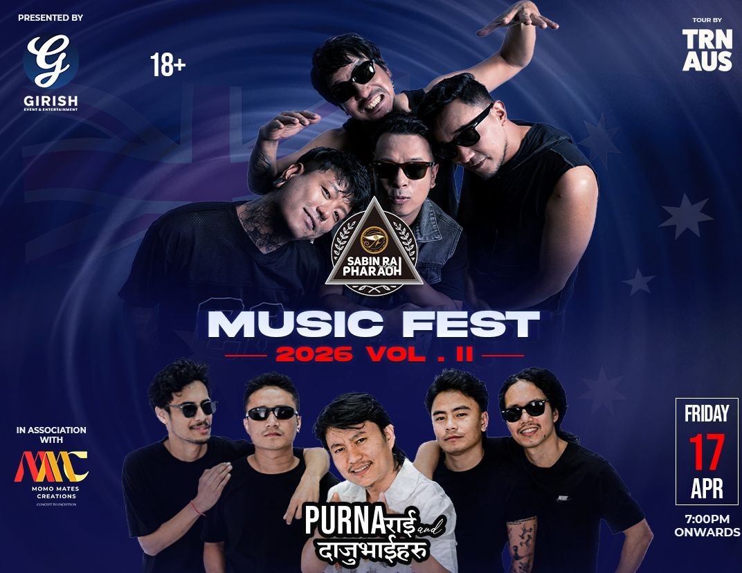 एडिलेड,अष्ट्रेलिया/ एडिलेड अष्ट्रेलियाको एडिलेडमा नेपाली सांगीतिक माहोललाई थप उत्साहपूर्ण बनाउने उद्देश्यसहित ‘म्युजिक फेस्ट २०२६ (भाग–२)’ आयोजना हुने भएको छ। नेपाली संगीतप्रेमीहरूका लागि विशेष मानिएको यस भव्य सांगीतिक कार्यक्रममा चर्चित गायक सबिन राई र उनको ब्याण्ड द फ्याराओ, पछिल्लो पुस्तामाझ लोकप्रिय पूर्ण राई तथा दाजुभाइहरू एउटै मञ्चमा आफ्नो प्रस्तुति दिने भएका छन्